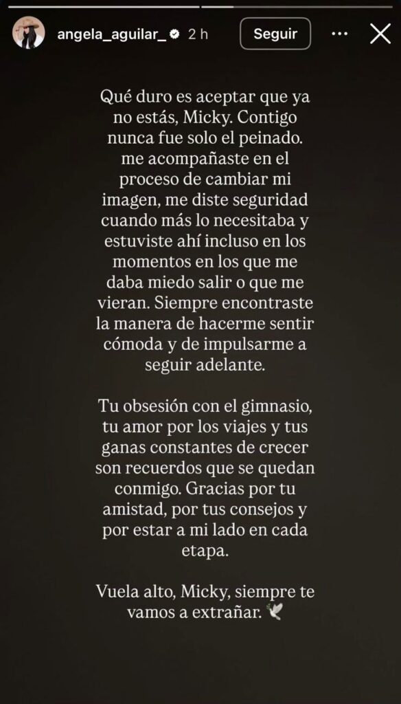 “Tu obsesión con el gimnasio, tu amor por los viajes y tus ganas constantes de crecer son recuerdos que se quedan conmigo. Gracias por tu amistad, por tus consejos y por estar a mi lado en cada etapa. Vuela alto, Micky, siempre te vamos a extrañar”, añadió la hija de Pepe Aguilar.
