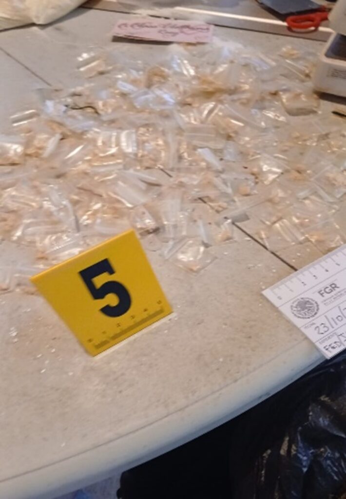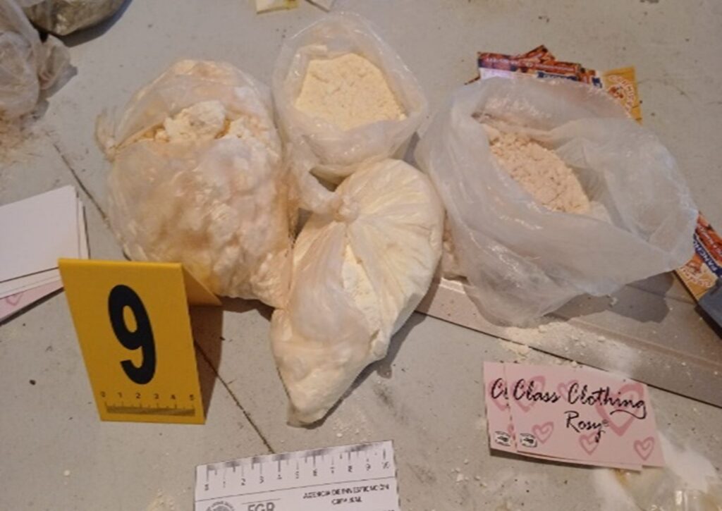 Durante la diligencia, agentes de la Policía Federal Ministerial (PFM), con apoyo de peritos y personal estatal, aseguraron una pistola, un cargador, cuatro básculas, una bolsa con 175 gramos de marihuana, un radio, ocho camisas tipo polo, 442 envoltorios con aparente cristal y ocho bolsas con cocaína.