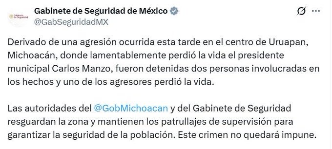 URUAPAN, MICHOACÁN. — El alcalde Carlos Manzo Rodríguez fue asesinado a balazos la noche del sábado 1 de noviembre mientras participaba en el tradicional Festival de Velas en la plaza principal de Uruapan. Las autoridades confirmaron su fallecimiento y que uno de los agresores fue abatido mientras otros dos fueron detenidos.