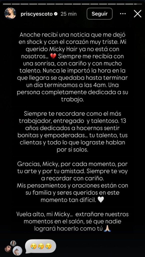 Tras conocerse la noticia, la influencer Priscila Escoto, una de sus clientas cercanas, compartió un mensaje de condolencias en redes sociales, expresando su tristeza por la pérdida y reconociendo el talento y calidez humana del estilista.
