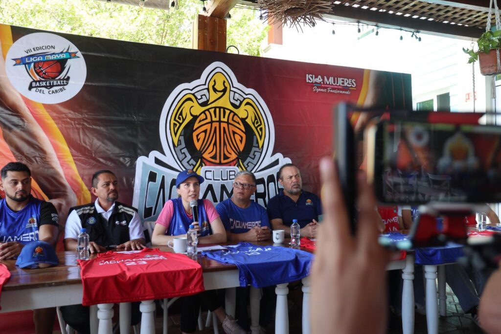 La Atenea Gómez Ricalde respalda a Caguameros en la presentación de la 7ª Liga Maya Caribe, al participar en la conferencia oficial del torneo desde Isla Mujeres, donde reafirmó el apoyo institucional al equipo local.