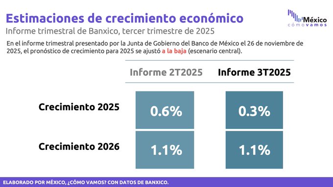 Aunque el panorama inmediato se ve complicado, Banxico se mantiene algo optimista para 2026, cuando estima un crecimiento del PIB en 1.1 %.