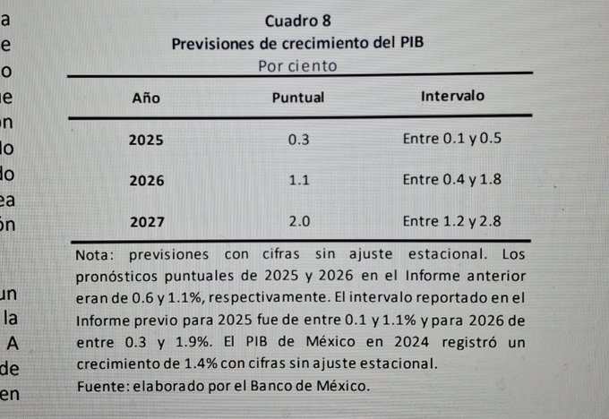 Banxico sorprendió hoy al anunciar una profunda revisión de su expectativa de crecimiento para 2025. En su más reciente informe, el banco central redujo la proyección del Producto Interno Bruto (PIB) del país de 0.6 % a apenas 0.3 %.