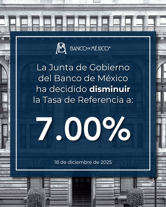El Banco de México (Banxico) anunció este jueves que recortó nuevamente su tasa de interés de referencia, como parte de su última decisión de política monetaria del año. Con este ajuste, la tasa quedó en 7 %, su nivel más bajo desde abril de 2022, en un contexto de presiones económicas moderadas y objetivos de inflación a mediano plazo.
