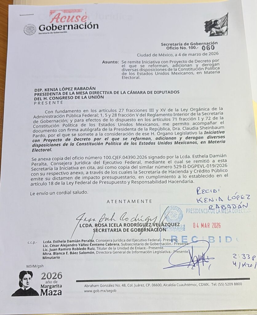 La iniciativa de reforma electoral de Claudia Sheinbaum llegó este 4 de marzo a la Cámara de Diputados y fue recibida por Kenia López Rabadán, presidenta de la Mesa Directiva en San Lázaro.