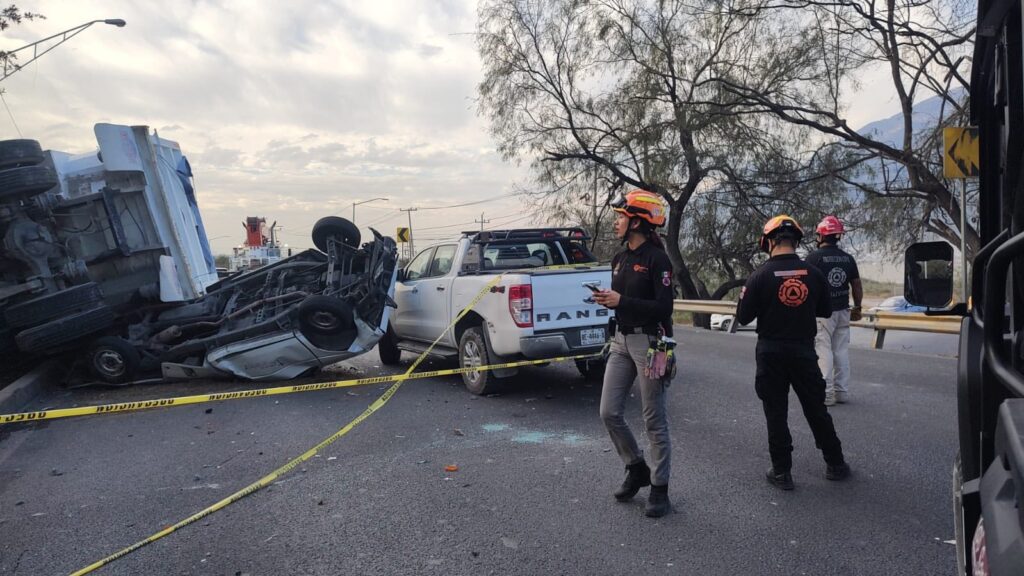 NUEVO LEÓN.– Un aparatoso accidente vial se registró en la Carretera Monterrey–Saltillo, a la altura del Callejón del Mármol, en la colonia Las Huertas, donde un vehículo de carga de tres y media toneladas perdió el control, volcó y terminó cayendo sobre una camioneta de una funeraria que transportaba un cuerpo en su caja.
