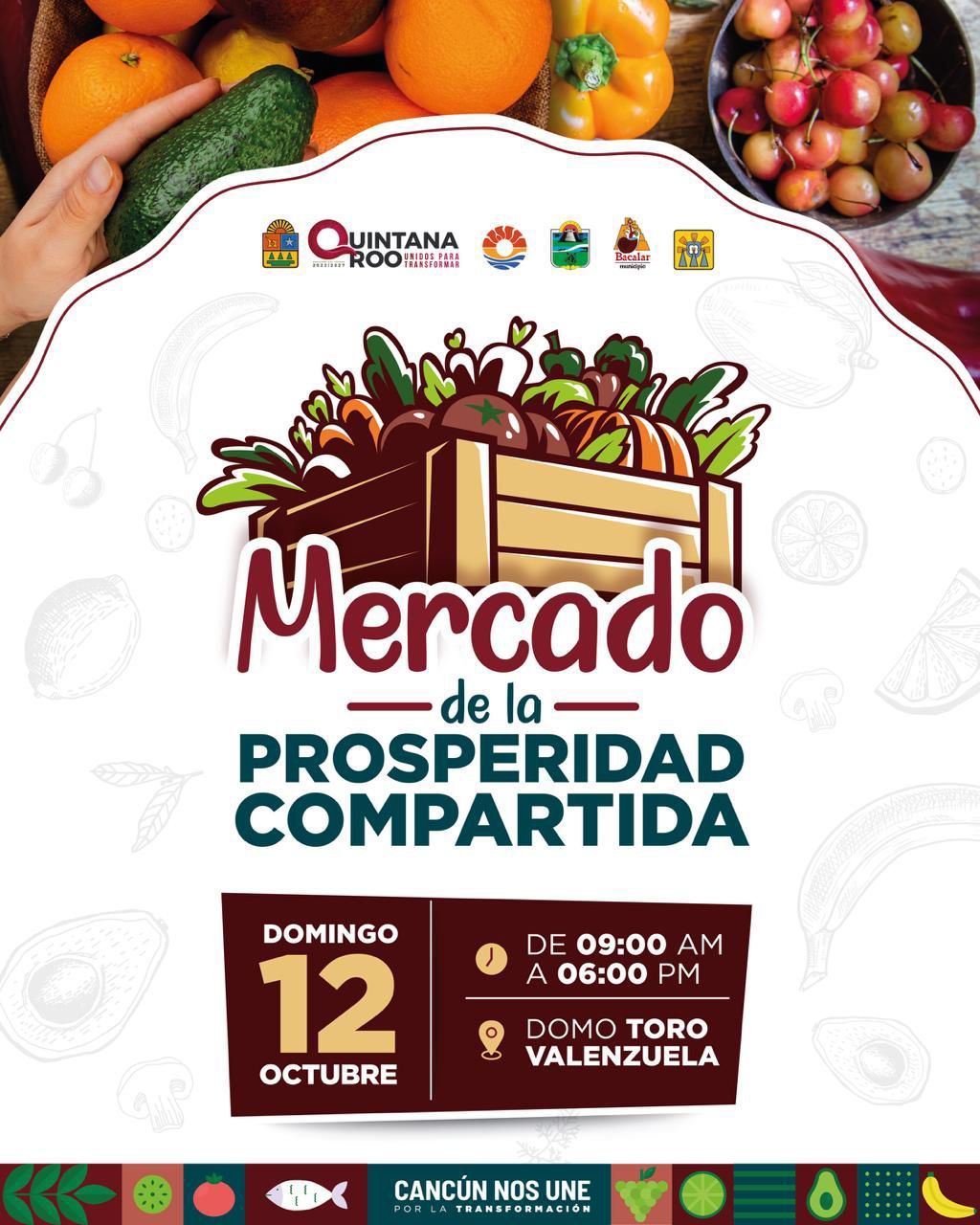 CANCÚN.- El Gobierno del Estado de Quintana Roo, en coordinación con el municipio de Benito Juárez, invita a los cancunenses a asistir al “Mercado de la Prosperidad Compartida”, que se llevará a cabo el domingo 12 de octubre, de 09:00 a 18:00 horas, en el Domo Toro Valenzuela.