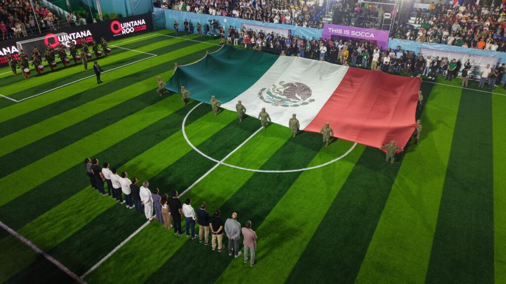 El evento también contó con honores al Lábaro Patrio con la bandera monumental como protagonista, un espectáculo artístico con puro talento cancunense, así como un desfile de banderas, show de láser y el mensaje inaugural del presidente de la Federación Internacional de Socca, David Leone.