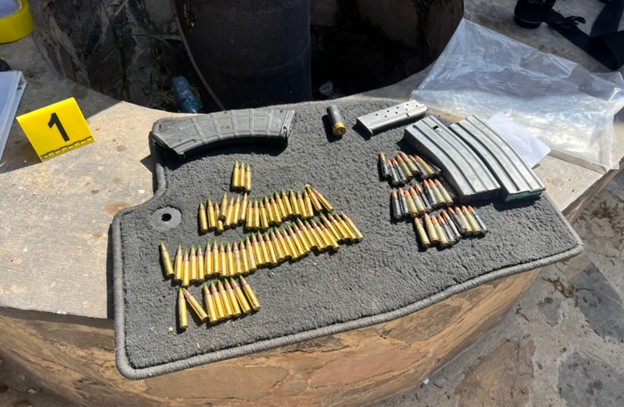 En el lugar fueron asegurados 24 cargadores de distintos calibres, más de 350 cartuchos, 14 chalecos tácticos, 21 aditamentos, además de diversas prendas y documentación. También se decomisaron 15 vehículos, 10 caballos, aves y un reptil, cuya procedencia y situación legal serán analizadas por las autoridades correspondientes.