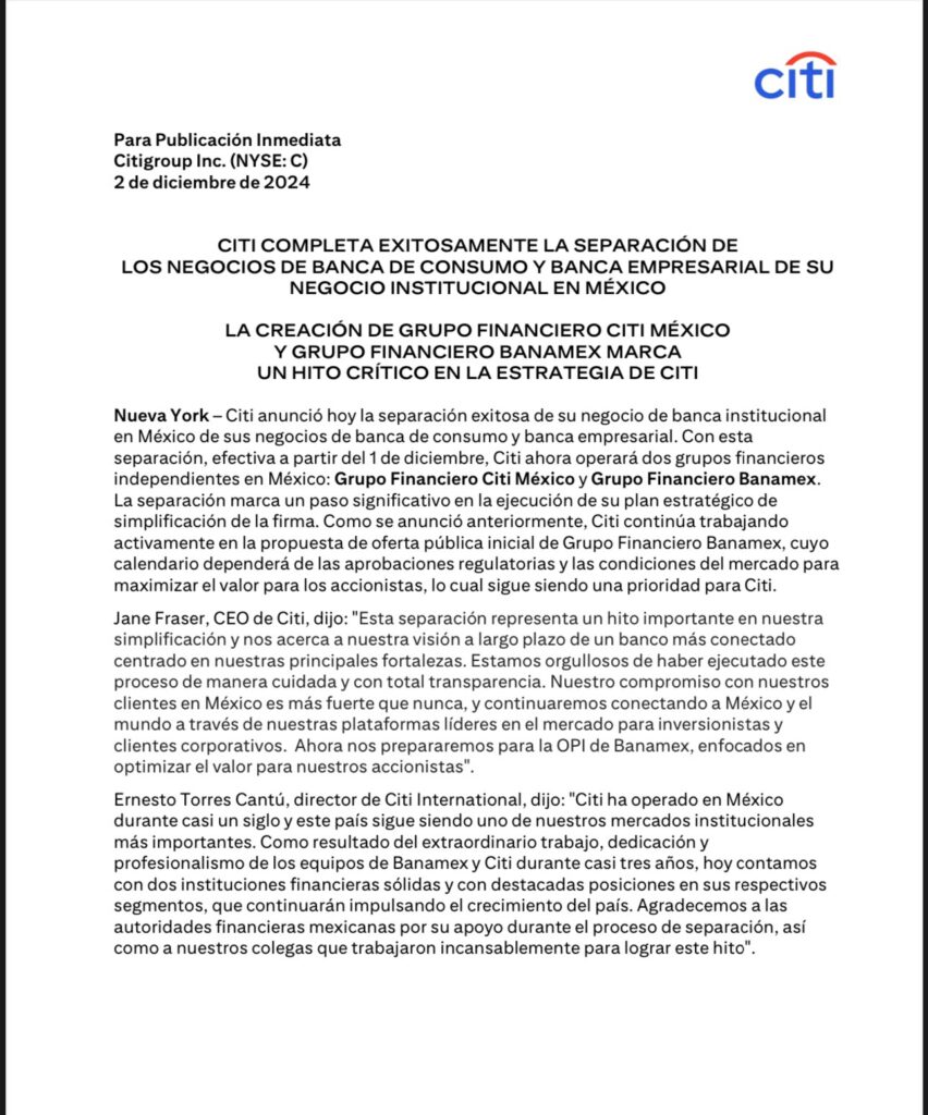 La desinversión de Banamex forma parte de la estrategia global de Citigroup de reconfigurar su presencia en México, con el objetivo de fortalecer su enfoque en segmentos específicos de negocio, mientras se acerca a la posibilidad de una oferta pública inicial (OPI) del banco, dependiendo de las condiciones del mercado y aprobaciones regulatorias.
