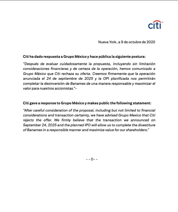 Grupo México propuso adquirir el 25% de Banamex a un múltiplo de 0.85 veces su valor contable y el 75% restante a 0.80 veces, superando ligeramente la oferta previamente acordada con Chico Pardo. Sin embargo, Citi optó por mantener su plan original, argumentando que la OPI permitirá maximizar el valor para sus accionistas y completar la desinversión de manera responsable.