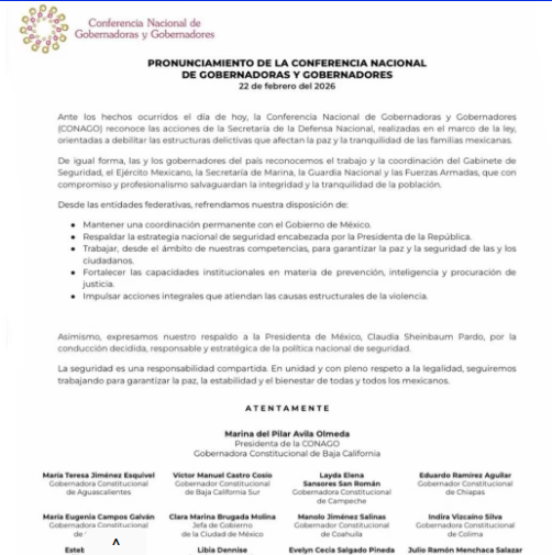 La Conferencia Nacional de Gobernadores (CONAGO) respalda acciones federales en seguridad y cierra filas con Sheinbaum, luego de emitir un pronunciamiento oficial de apoyo a la política de seguridad nacional encabezada por la presidenta de México, Claudia Sheinbaum Pardo, tras los hechos recientes relacionados con la muerte de Nemesio “El Mencho”.