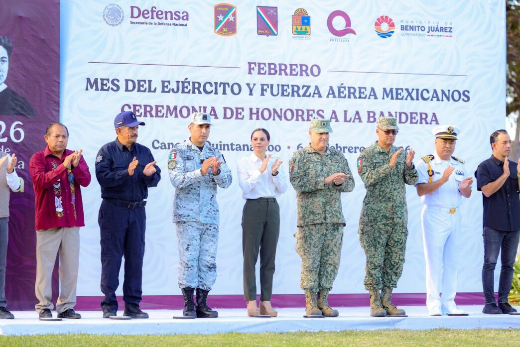 CANCÚN.- En el marco del Mes del Ejército y Fuerza Aérea Mexicanos, la Presidenta Municipal, Ana Paty Peralta, atestiguó la Ceremonia de Honores a la Bandera que se realizó en el Asta Bandera Monumental de la Zona Hotelera, con el objetivo de reafirmar el respeto y la lealtad a los símbolos patrios, instituciones de la República y sobre todo, al pueblo de México.
