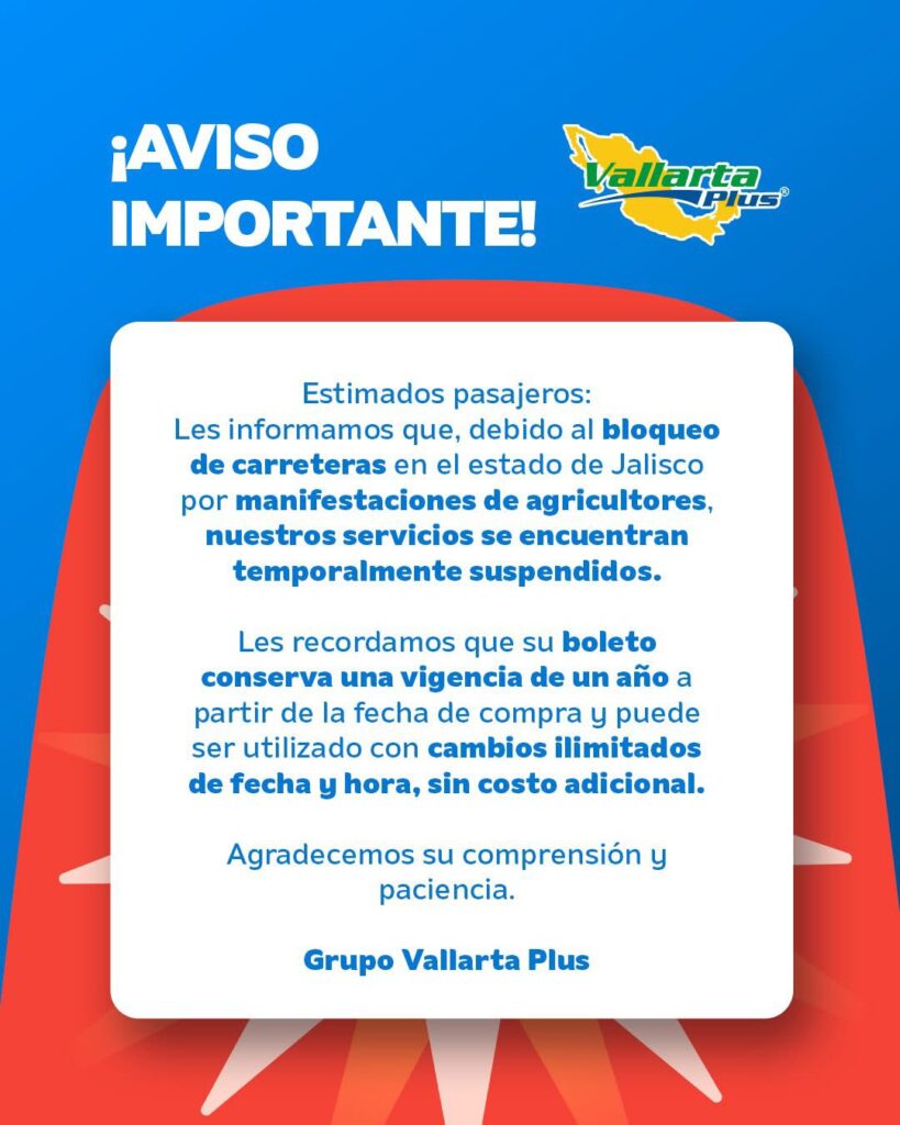 La empresa Vallarta Plus anunció la suspensión temporal de sus servicios, debido a los cierres viales y a la falta de condiciones seguras para circular hacia la costa y otras regiones del país.