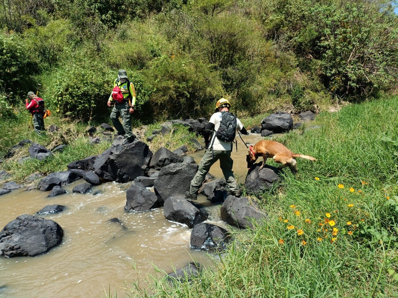 El segundo oficial Jonathan salió a cargo de dos grupos de trabajo apoyados por un binomio canino especializado en rescate. Las acciones se concentran en el rancho El Guayabo, donde personal de las corporaciones y familiares descienden al cauce para intentar dar con el paradero del hombre.