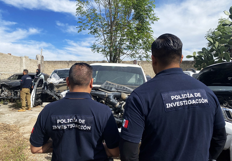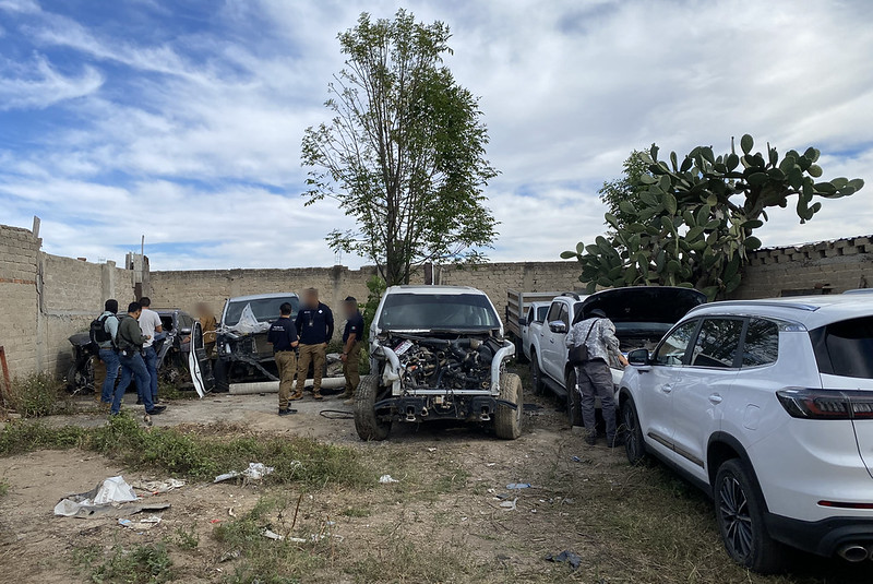 De acuerdo con información oficial, diez vehículos con números de serie alterados fueron asegurados durante un cateo, algunos de ellos relacionados con carpetas de investigación por robo.
