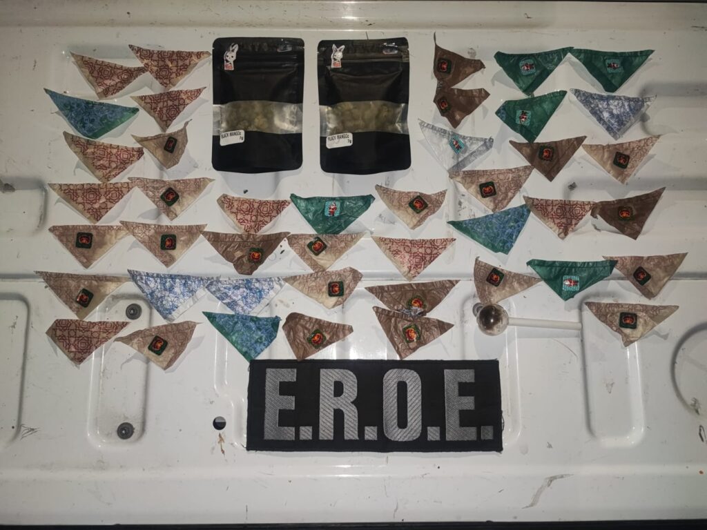 Tras ser interceptado, los elementos realizaron una revisión precautoria, localizando entre sus pertenencias 52 envoltorios plásticos con material granulado, con características similares a la droga conocida como cristal, así como dos envoltorios con vegetal verde, presuntamente marihuana.