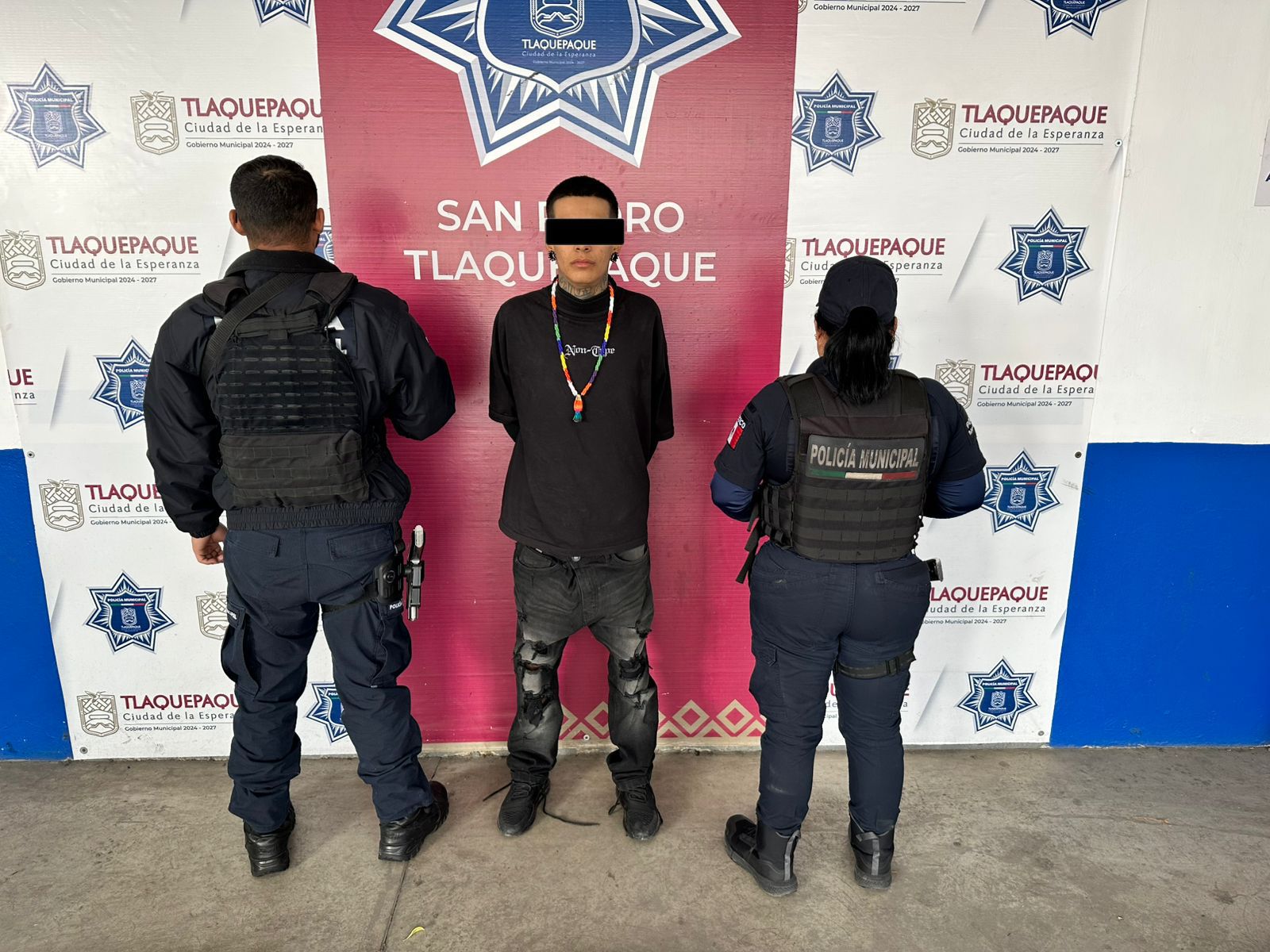 Tlaquepaque, Jalisco.- Elementos de la Secretaría de Seguridad y Protección Ciudadana de San Pedro Tlaquepaque detuvieron a un joven acusado de su presunta participación en un robo en un hotel de Tlaquepaque, ubicado en la colonia Lomas del Cuatro