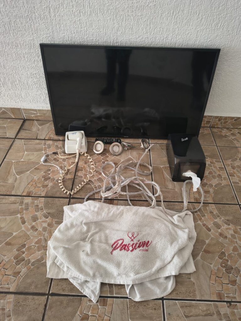 Entre los artículos asegurados se encontraban una pantalla, una secadora de cabello, luminarias, cableado y un portapapel higiénico, además de otros objetos de uso interno.