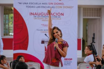 TULUM.- Al entregar el domo recién construido en la escuela primaria Tulum, en este municipio del mismo nombre, la gobernadora Mara Lezama Espinosa exhortó a alumnas y alumnos a tomar decisiones correctas, a evitar normalizar la violencia y a vivir con el derecho de ser felices y alcanzar sus sueños.