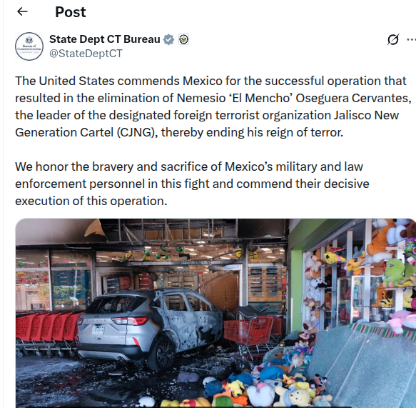 Estados Unidos felicita a México por muerte de El Mencho y destacó el éxito del operativo que permitió eliminar a Nemesio Oseguera Cervantes, alias “El Mencho”, líder del Cártel Jalisco Nueva Generación (CJNG).