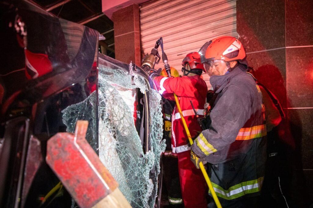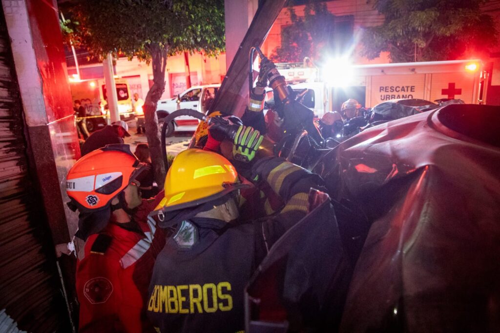 Entre los heridos, una mujer quedó atrapada dentro del vehículo compacto, por lo que fue necesario el apoyo de elementos de la Cruz Roja, quienes lograron rescatarla con éxito antes de trasladarla a un hospital para recibir atención médica.