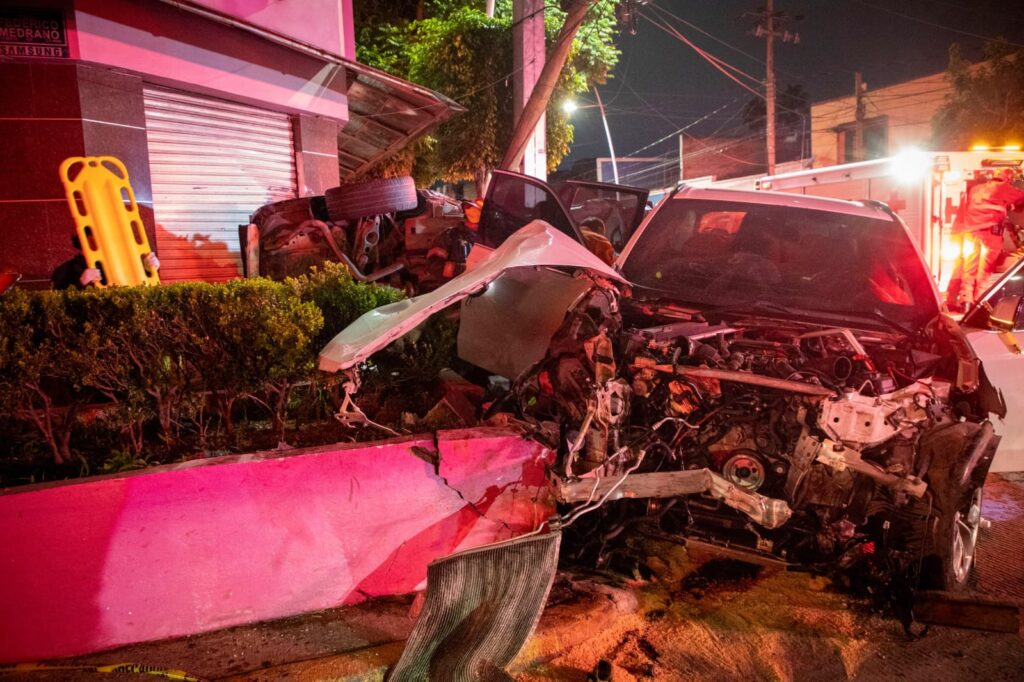 El impacto provocó daños materiales considerables: un poste de telefonía quedó quebrado, un negocio presentó afectaciones en su fachada, y ambos vehículos resultaron con daños severos.