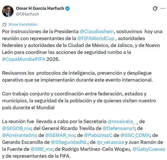 El secretario de Seguridad y Protección Ciudadana, Omar García Harfuch, explicó que la reunión fue por instrucciones de la presidenta Claudia Sheinbaum.