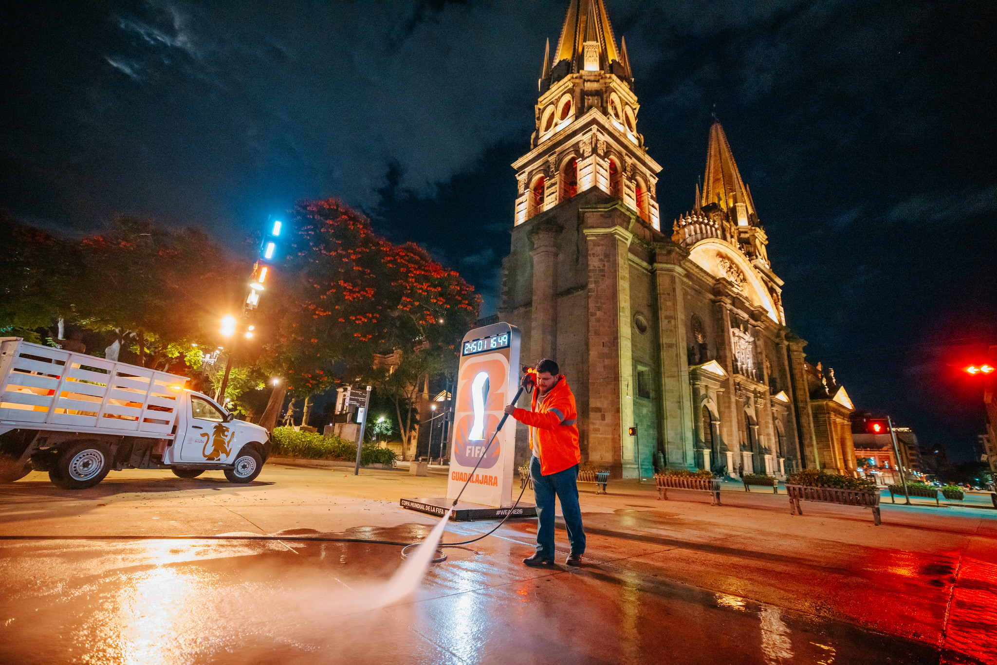 Guadalajara, Jalisco.- Con el objetivo de recibir en óptimas condiciones a las y los peregrinos que participarán en la tradicional Romería, el Gobierno de Guadalajara realizó un operativo nocturno de limpieza en el Centro Histórico, a través de la Coordinación de Servicios Públicos Municipales.