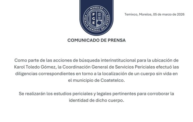 La Fiscalía General del Estado de Morelos activó un operativo de búsqueda para localizar a Karol Toledo en Morelos.