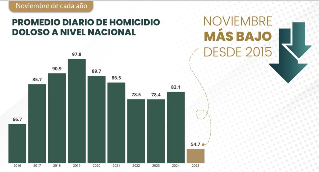 CDMX.-Durante su informe de seguridad, Omar García Harfuch destacó que los homicidios dolosos en México han caído un 37 % desde septiembre de 2024, lo que representa una reducción de 32 asesinatos diarios respecto al promedio anterior.