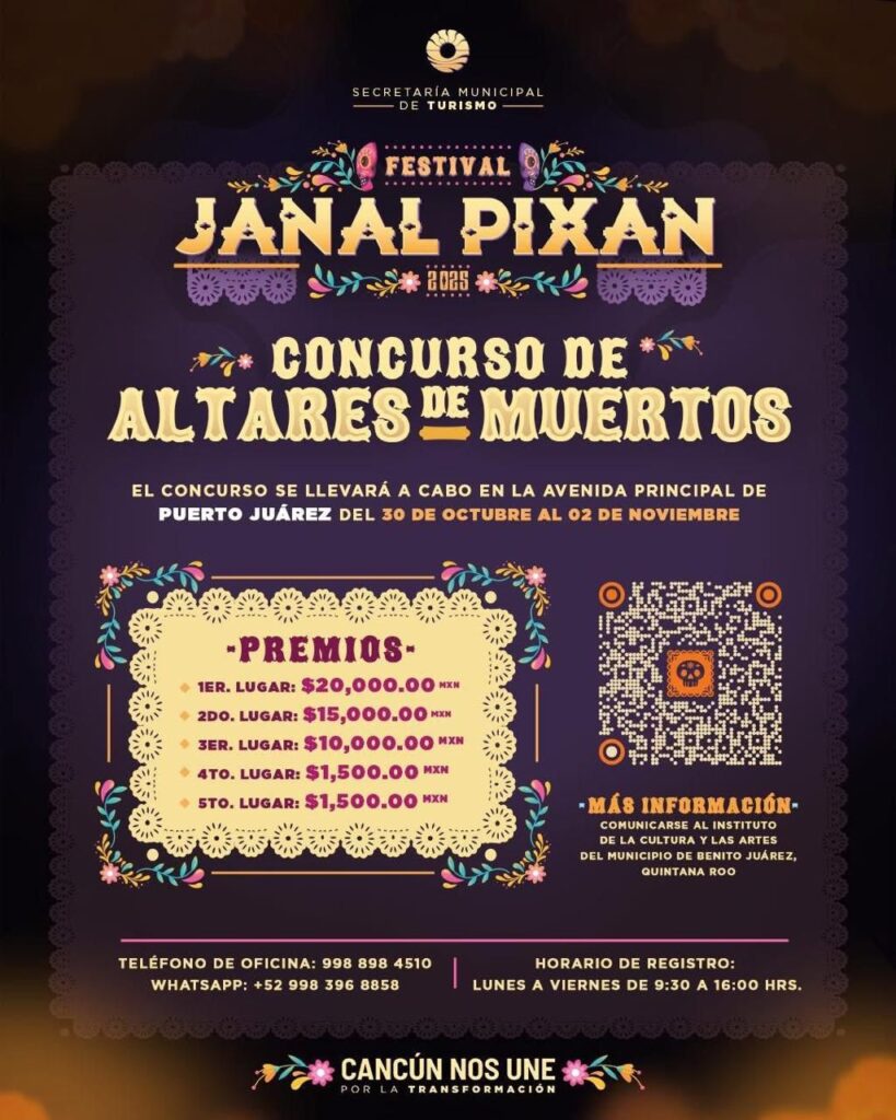 CANCÚN.- El Ayuntamiento de Benito Juárez, a través de la Secretaría de Turismo, invita a las y los cancunenses a ser protagonistas del Festival Janal Pixan 2025 y participar de los concursos de “Catrinas y Catrines ” y “Altares de Muertos”, los cuales sostienen premios de hasta 20 mil pesos.