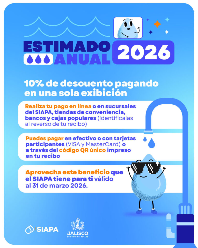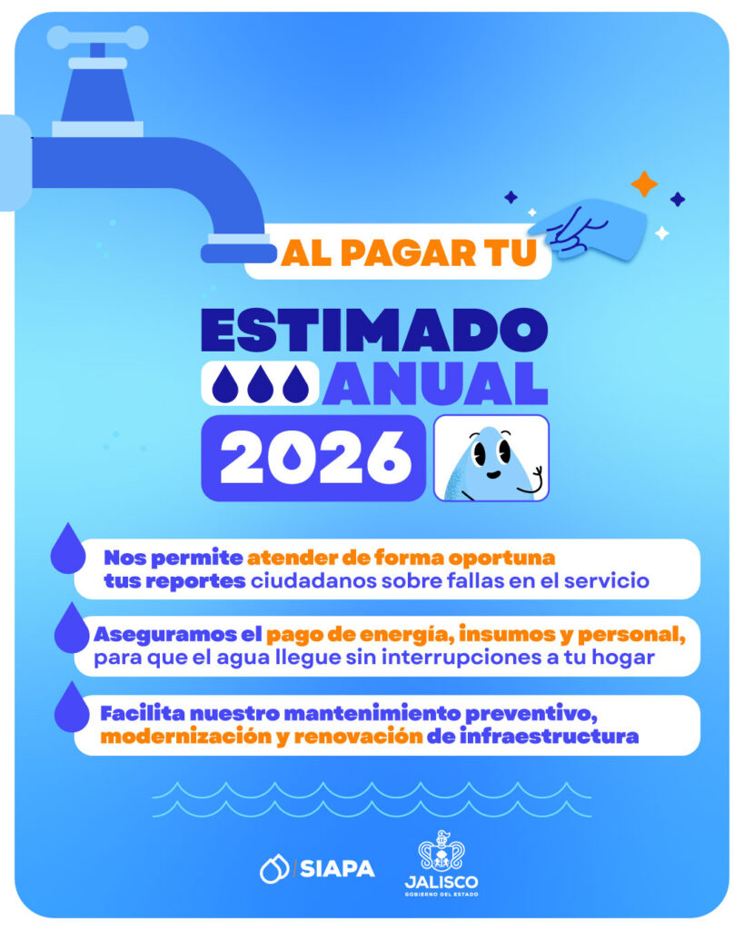 Jalisco, México.- El Sistema Intermunicipal de los Servicios de Agua Potable y Alcantarillado (SIAPA) anunció que a partir del lunes 1 de diciembre iniciará el periodo para pagar el Estimado Anual 2026, ofreciendo un descuento del 10% por pronto pago a las y los usuarios cumplidos.