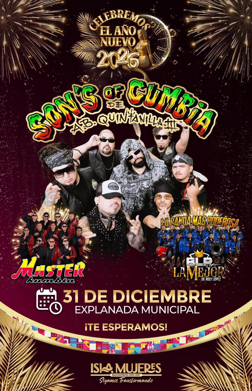 Para visitantes y locales, Isla Mujeres ofrece el Gran Baile de Año Nuevo 2026 en la Explanada Municipal, con artistas de renombre como Son’s Of Cumbia de AB Quintanilla, Máster Kumbia y La Banda Más Poderosa, la Mejor de Roly López.