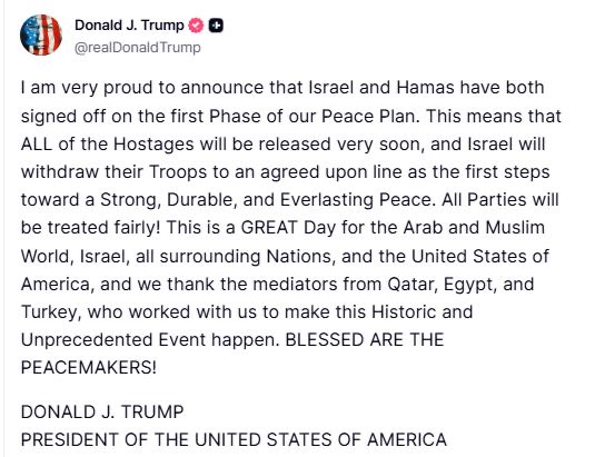 El presidente de Estados Unidos, Donald Trump, anunció que Israel y Hamás han firmado el acuerdo relativo a la primera fase de su propuesta de paz para Gaza. Este paso representa uno de los avances más concretos en las negociaciones mediadas en Egipto para frenar el conflicto de dos años.