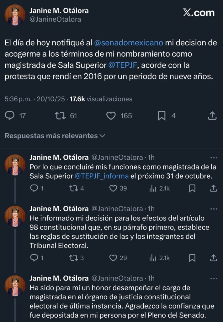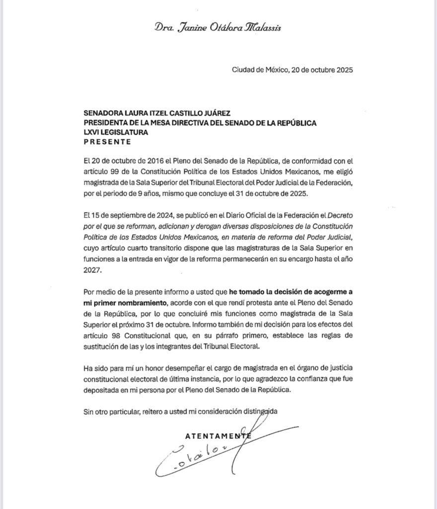 CDMX.- La magistrada Janine Otálora Malassis confirmó que el próximo 31 de octubre de 2025 dejará su cargo como integrante de la Sala Superior del TEPJF, decisión que ya notificó al Senado de la República.