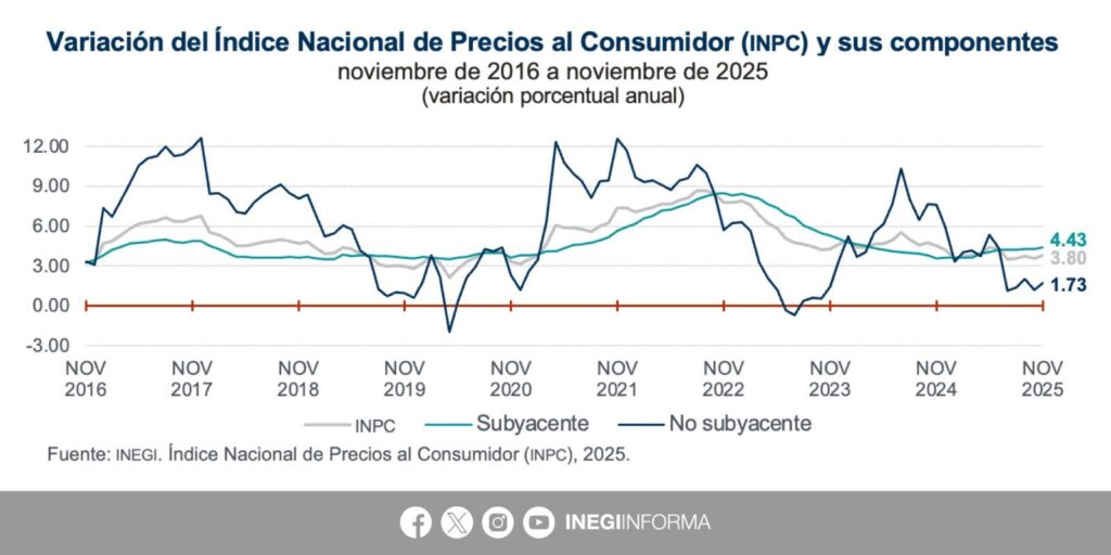 La inflación general en México dio un giro al alza en noviembre de 2025, alcanzando una tasa anual de 3.80 %, según los datos más recientes del Instituto Nacional de Estadística y Geografía (INEGI).