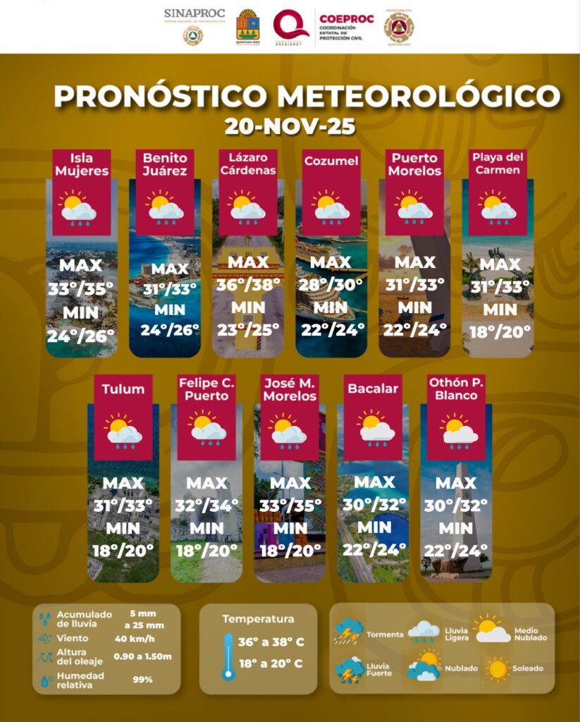 Este jueves arrojará un panorama húmedo sobre el estado de Quintana Roo. Se anticipan lluvias intermitentes acompañadas de chubascos por la tarde, principalmente en zonas costeras y turísticas.