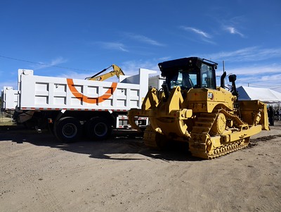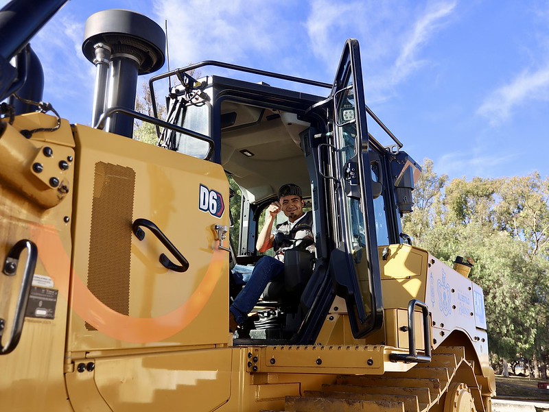 El módulo de maquinaria incluye una excavadora, dos camiones de volteo, un tractor D-6 y una pipa de agua, herramientas clave para mantenimiento de caminos rurales, bordería y atención a contingencias.