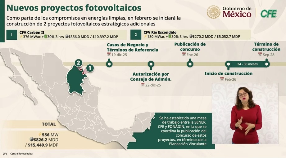 El paquete incluye 20 proyectos de generación renovable —15 fotovoltaicos y 5 eólicos— que aportarán un total de 3,320 megawatts (MW) de capacidad instalada y otros 1,488 MW en almacenamiento de energía, con inversiones privadas por 4 752 mdd, además de una central fotovoltaica en Puerto Peñasco, Sonora, con un costo de 710 mdd.