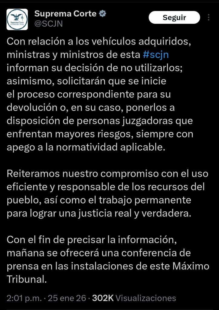 La Suprema Corte de Justicia de la Nación (SCJN) confirmó que las ministras y ministros decidieron no utilizar los nueve vehículos tipo SUV blindados y que iniciarán el procedimiento para su devolución o reasignación a juezas y jueces que enfrentan mayores riesgos en sus funciones.