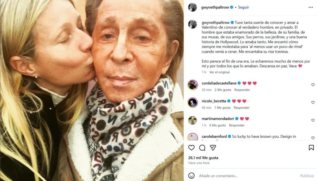 Por su parte, Gwyneth Paltrow compartió uno de los mensajes más íntimos y conmovedores. La actriz recordó la relación cercana que mantuvo con Valentino, quien la consideró una de sus musas, resaltando su amor por la belleza, la familia y las pequeñas cosas de la vida.