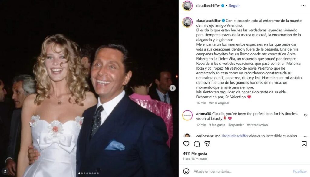 Con palabras llenas de admiración, destacó su bondad, su elegancia infinita y el privilegio de haber desfilado para él, enviando además un mensaje de apoyo a Giancarlo Giammetti, su socio y gran compañero de vida.