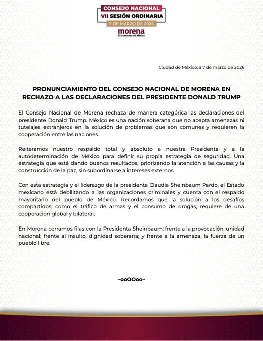 Morena sostuvo que Morena rechaza señalamientos de Trump y defenderá la soberanía nacional.