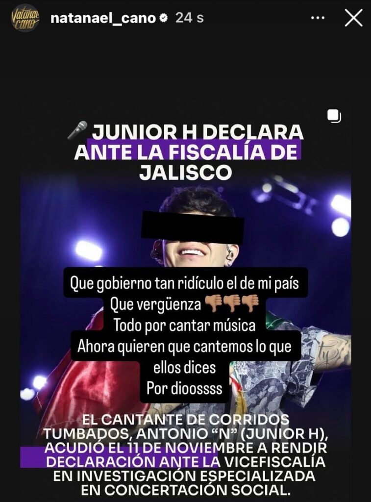 La molestia de Cano surge luego de que Junior H fuera acusado de presunta apología del delito, tras interpretar “El Azul”—tema que menciona a un líder del crimen organizado— durante su presentación en las Fiestas de Octubre de Zapopan.