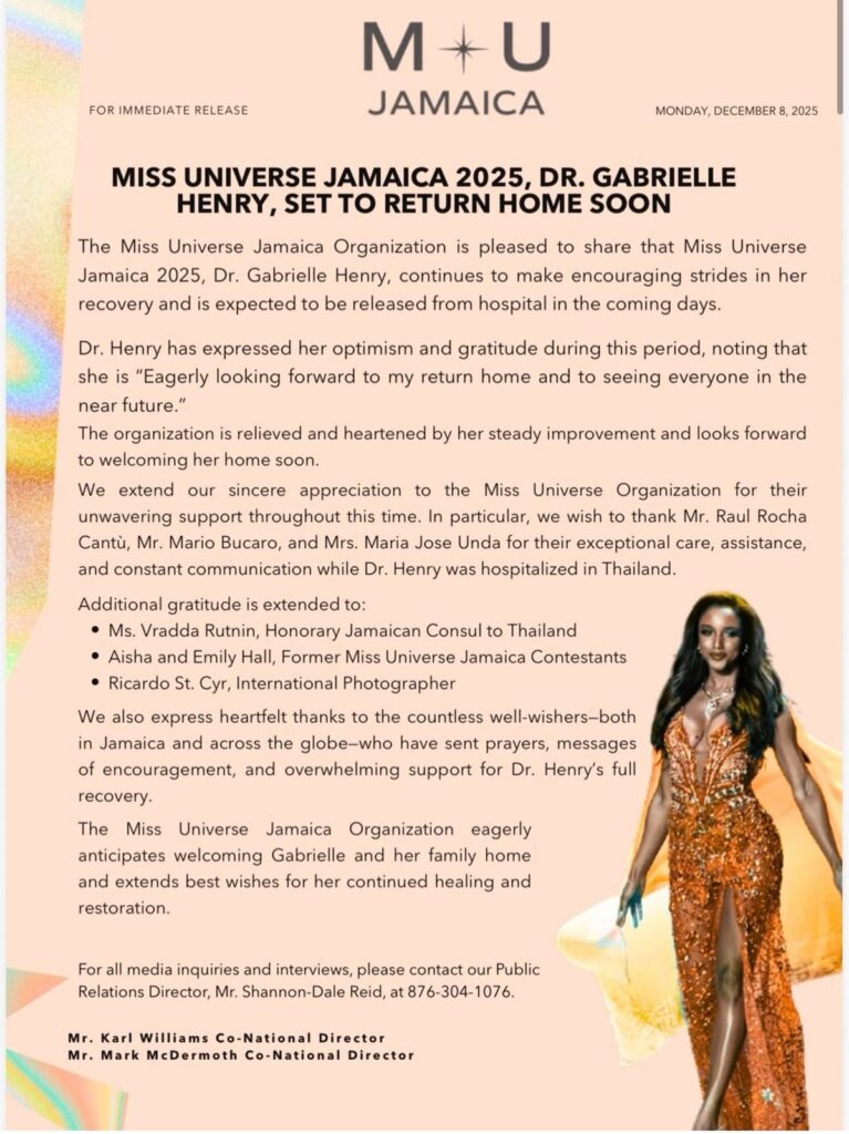 La organización informó que la modelo será trasladada próximamente a Jamaica para continuar su recuperación. El retorno será mediante repatriación médica y con acompañamiento profesional, para luego ser internada directamente en un hospital de su país.
