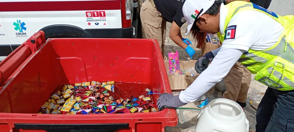 PLAYA DEL CARMEN.- En seguimiento a las acciones de prevención y reducción de riesgos impulsadas por la presidenta municipal Estefanía Mercado durante el mes de diciembre, la Secretaría de Protección Civil, Prevención de Riesgos y Bomberos, llevó a cabo la destrucción de aproximadamente una tonelada de pirotecnia asegurada en el marco del Operativo Guadalupe-Reyes.