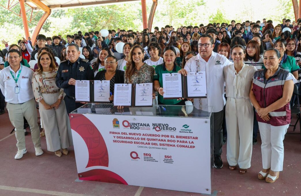 CANCÚN.- La Presidenta Municipal, Ana Paty Peralta, firmó como testigo de honor el Nuevo Acuerdo por el Bienestar y Desarrollo de Quintana Roo para la Seguridad Escolar del Sistema Colegio Nacional de Educación Profesional y Técnica (CONALEP) encabezada por la gobernadora, Mara Lezama, con el objetivo de fortalecer los protocolos de actuación ante emergencias y situaciones de violencia en entornos escolares, por medio de videovigilancia del Complejo de Seguridad Quintana Roo C5.