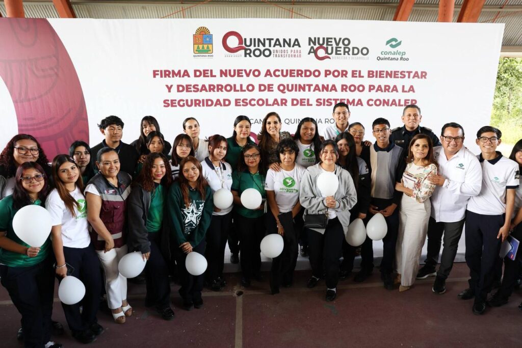 Asimismo, el director del CONALEP Plantel II, Aníbal José Montalvo Pérez, destacó que gracias a esta firma del Nuevo Acuerdo por el Bienestar y Desarrollo de Quintana Roo para la Seguridad Escolar del Sistema CONALEP se incluirá la interconexión de las cámaras con el C5, para seguir generando entornos seguros; además a través de la Secretaría de Seguridad Ciudadana se ha capacitado al personal docente y administrativo en primeros auxilios, psicológicos, gestión emocional, y habilidades socioemocionales, así como la revisión de protocolos para la atención de incidentes de seguridad que se registren en cada uno de los planteles y ante ello, la comunidad estudiantil se encuentra feliz por construir y sumar a este gran proyecto de construcción de paz.