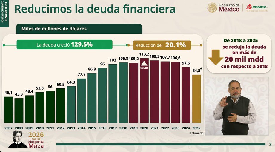 Durante la conferencia matutina encabezada por la presidenta Claudia Sheinbaum Pardo, la titular de Energía, Luz Elena González Escobar, detalló que esta reducción, la más significativa en años recientes, coloca a la empresa estatal en un nivel de deuda históricamente menor y ha sido reconocida favorablemente por los mercados financieros internacionales.
